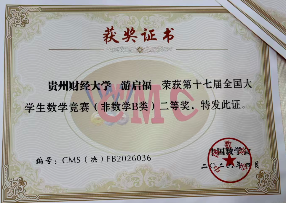 近日,第十七届全国大学生数学竞赛决赛圆满落幕。我校应用经济学院24级本科生游启福同学凭借扎实的数学功底与出色的临场发挥,在非数学专业组B类比赛中脱颖而出,荣获全国二等奖,为学校争得荣誉。