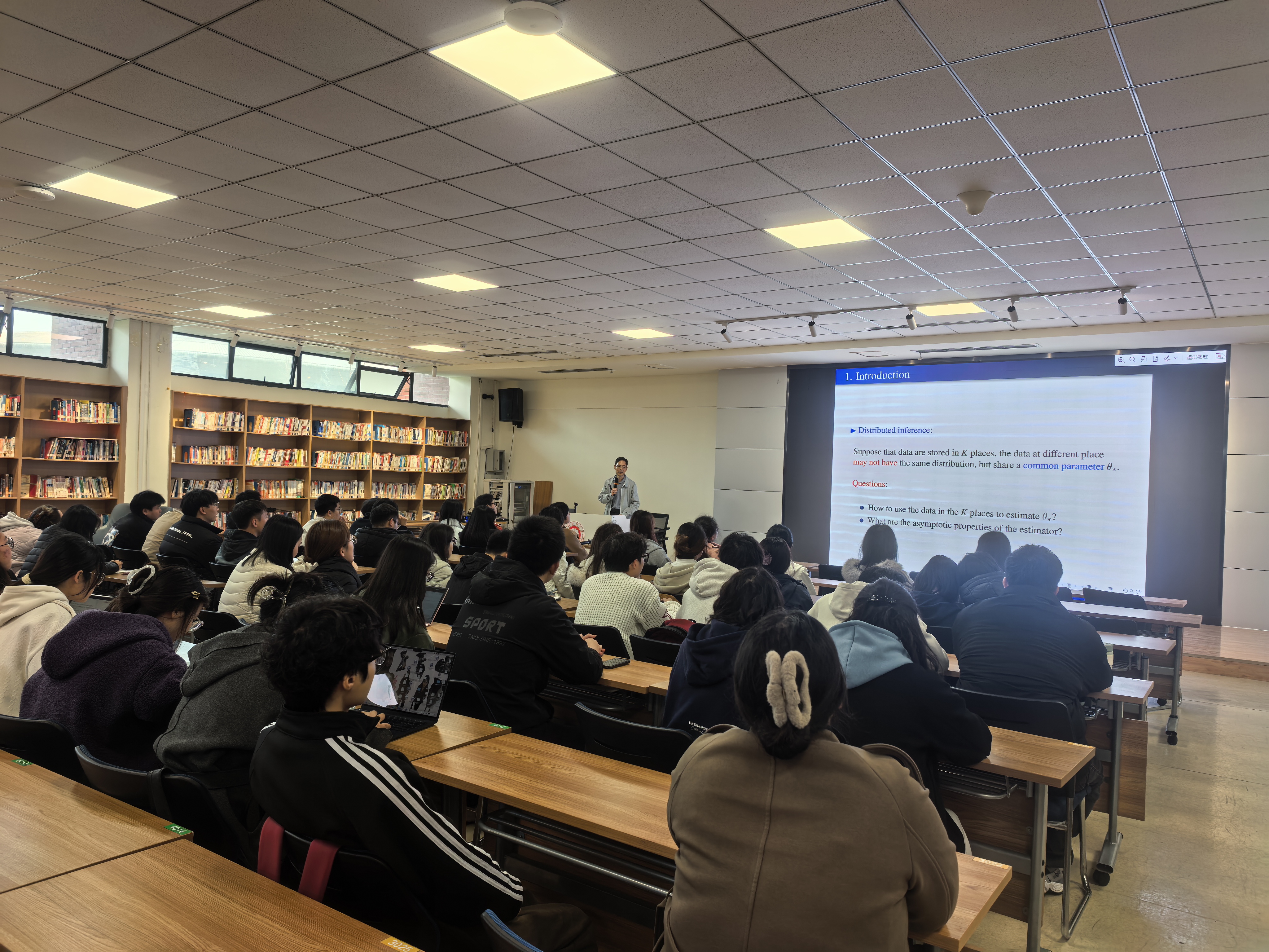 报告会上,邵启满教授以《异质性下的统计推断》为主题,展开系统深入的学术分享。他首先从学生熟知的大数定律和中心极限定理出发,介绍常规统计推断问题的学术进展,逐步引入不同数据块间异质分布条件下统计推断问题存在的挑战。邵启满教授讲解了人工智能时代异质性数据分布式统计推断的重要性和机遇,分享了自己的探索研究历程,并详细讲解了他提出的一种自正则化加权分布式估计量,讲解了其渐近正态性及Cramer型中偏差定理。