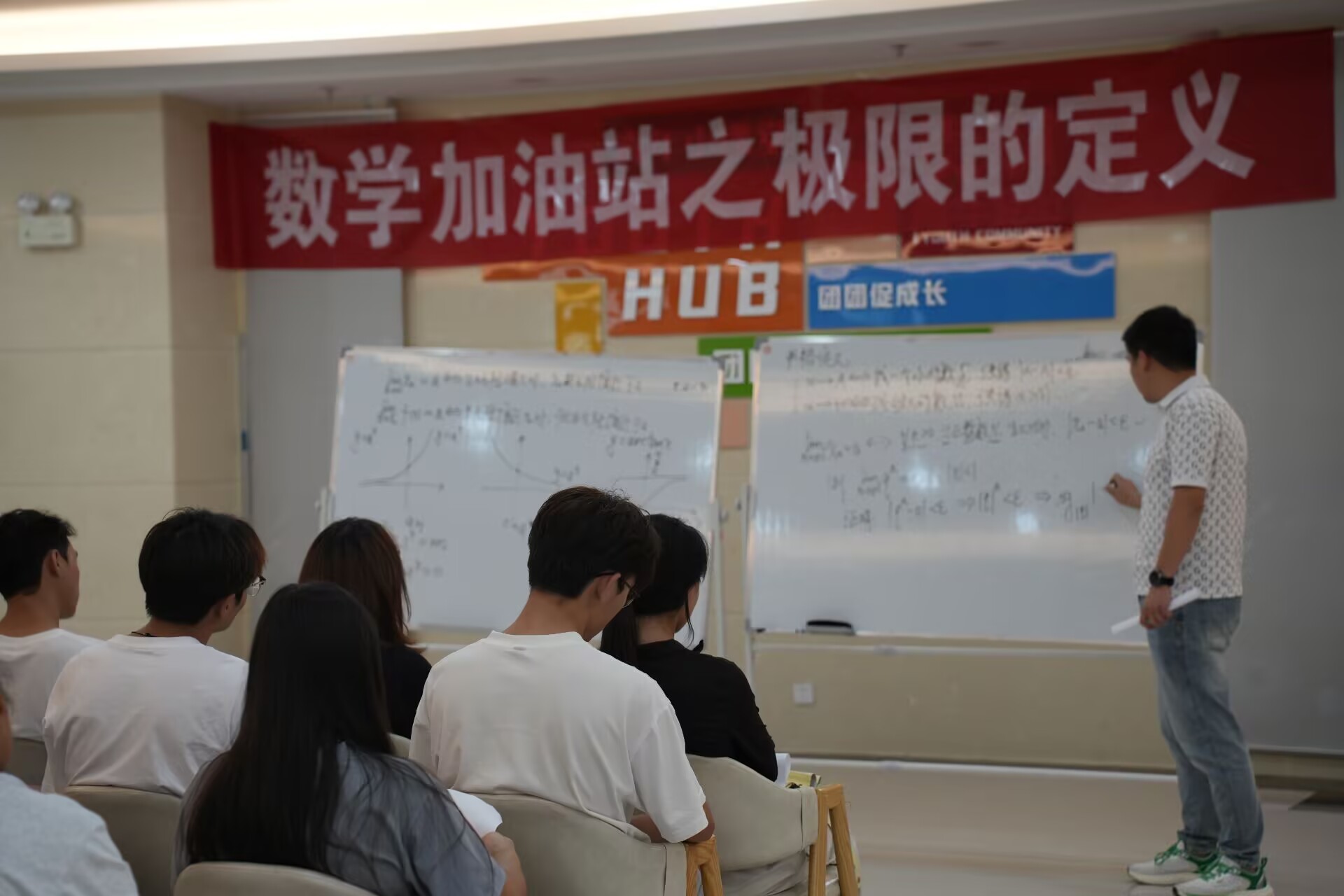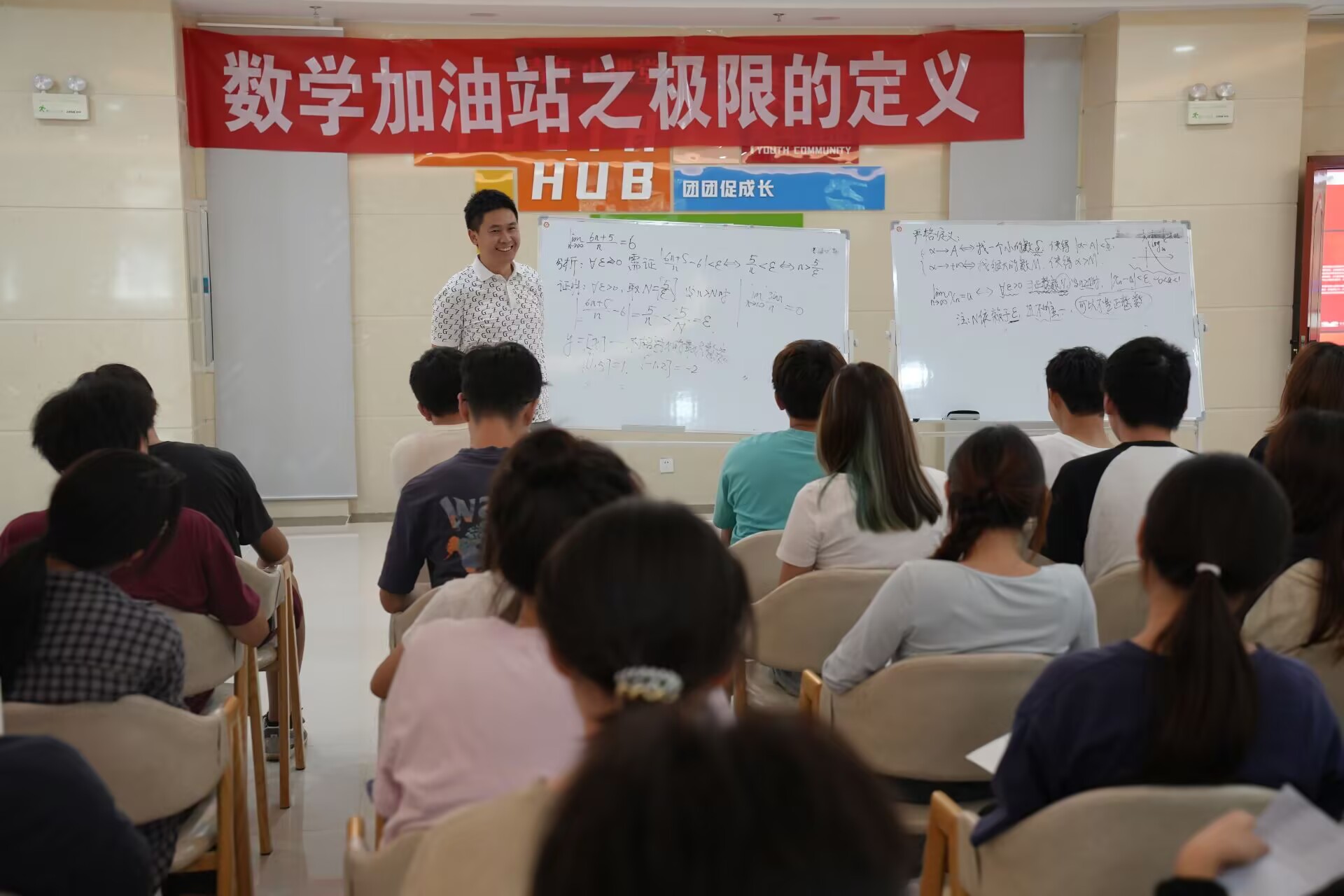 9月19日,数学与统计学院在学生活动中心一楼青年驿站开展第37期“数学加油站”活动,主题为极限的定义,由学院周龙桥老师主讲,来自各学院同学参与。